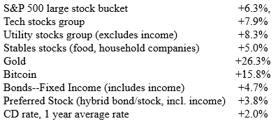 Gold and bitcoin have jumped nicely during the turmoil of tariff issues and international conflict as investors look to invest funds in what they consider a safe haven. Safe utility company stocks have also benefited from this move.